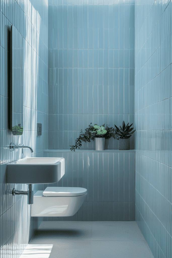 A minimalist approach to bathroom design can create a serene and clutter-free atmosphere, as seen in this soft blue space. The vertically laid tiles emphasize height, making the narrow room feel more expansive and airy. A floating sink and wall-mounted toilet enhance the streamlined aesthetic, maintaining an open floor space for a clean and modern look. Small potted plants add a natural touch, bringing warmth to the otherwise cool-toned environment.