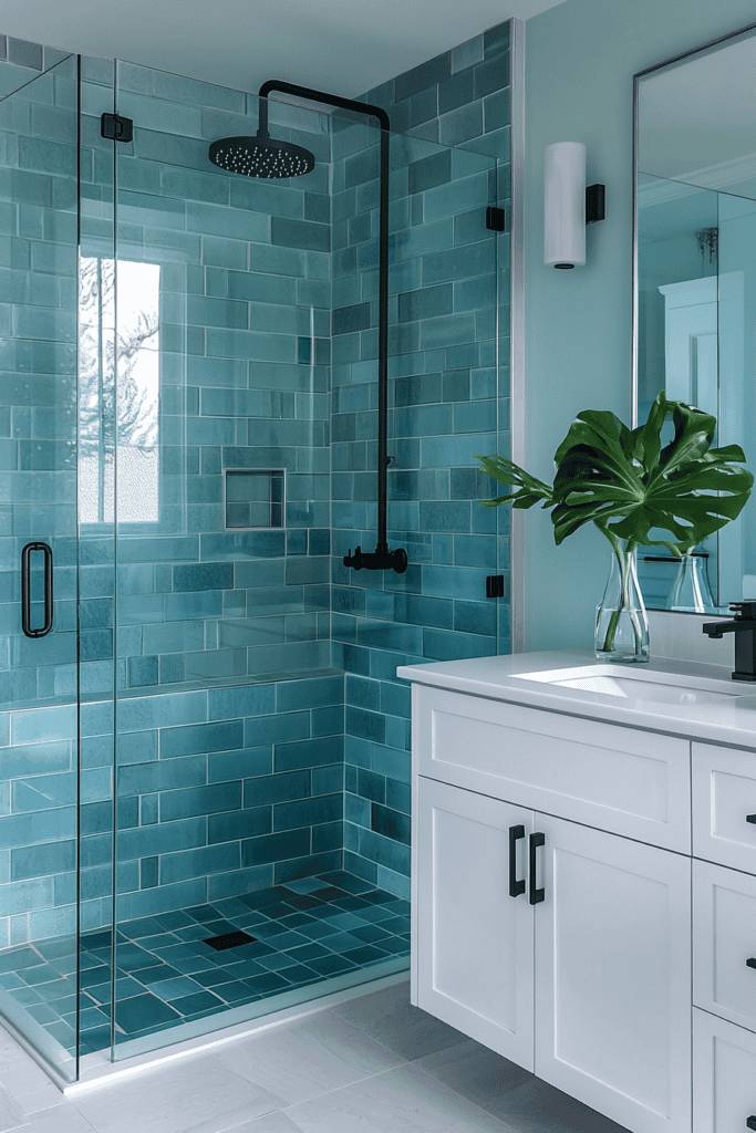 A vibrant teal shower area creates a focal point in this bright and airy bathroom, bringing a refreshing tropical vibe. The mix of deep greenish-blue tiles with black fixtures enhances the modern aesthetic, offering a striking contrast. The white vanity keeps the space balanced, ensuring that the darker hues don’t overpower the room. A large mirror and glass shower enclosure maximize light reflection, keeping the area feeling spacious and open.