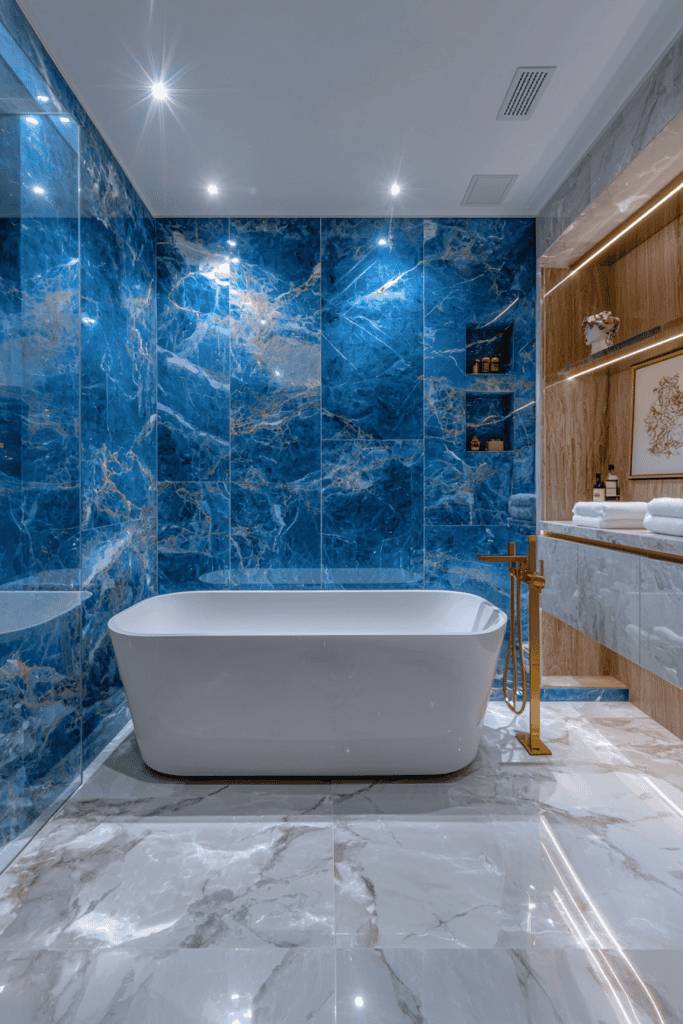 A bathroom adorned with deep blue marble tiles exudes grandeur and elegance, creating a dramatic yet inviting atmosphere. The rich veining in the marble adds texture and depth, making the space feel luxurious and unique. A freestanding white bathtub acts as a centerpiece, standing in beautiful contrast to the dark, moody walls. Gold fixtures, including the sleek tub filler and shelving accents, enhance the opulence, tying the elements together harmoniously.