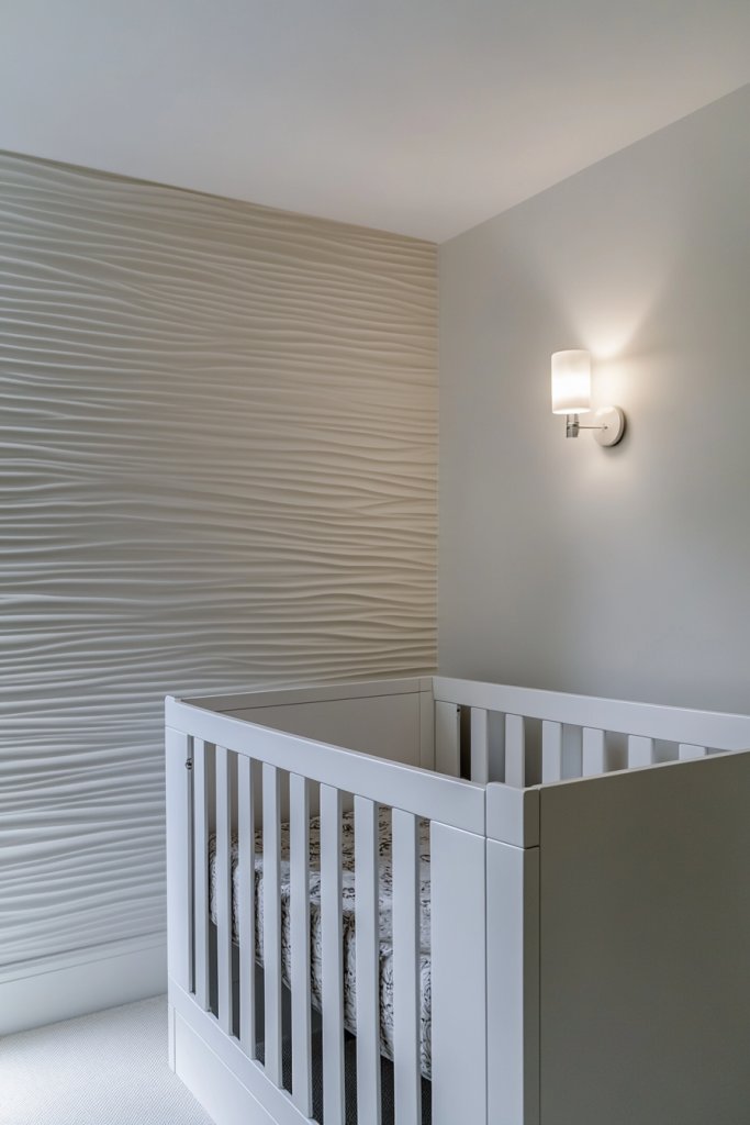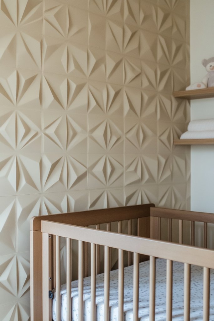 Picture textured panels in geometric, herringbone, or mosaic patterns applied behind the crib or changing area. They come in various finishes—matte, glossy, or textured—to suit your style. Pair with simple battens or painted walls to keep the focus on the panels. The result is a modern, polished look that’s easy to change as your tastes evolve.