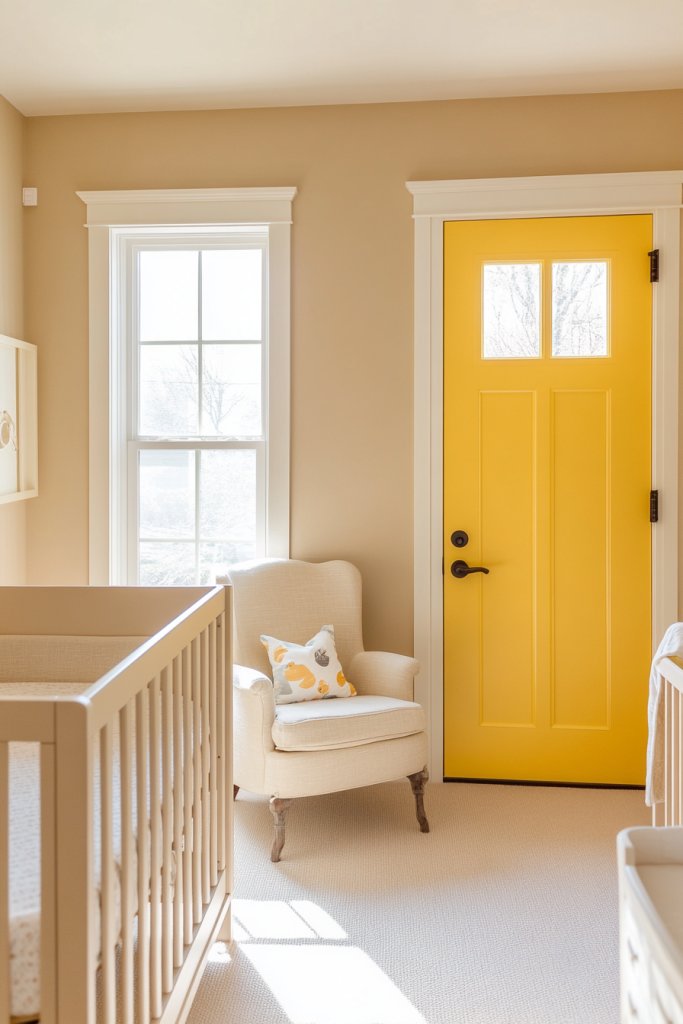 Want a nursery that feels calm but still lively? Neutral wall tones paired with brightly painted door and window frames create a balanced, cheerful space. It’s a clever way to add pops of color without overwhelming the senses. Perfect for parents who want versatility and energy in one package.