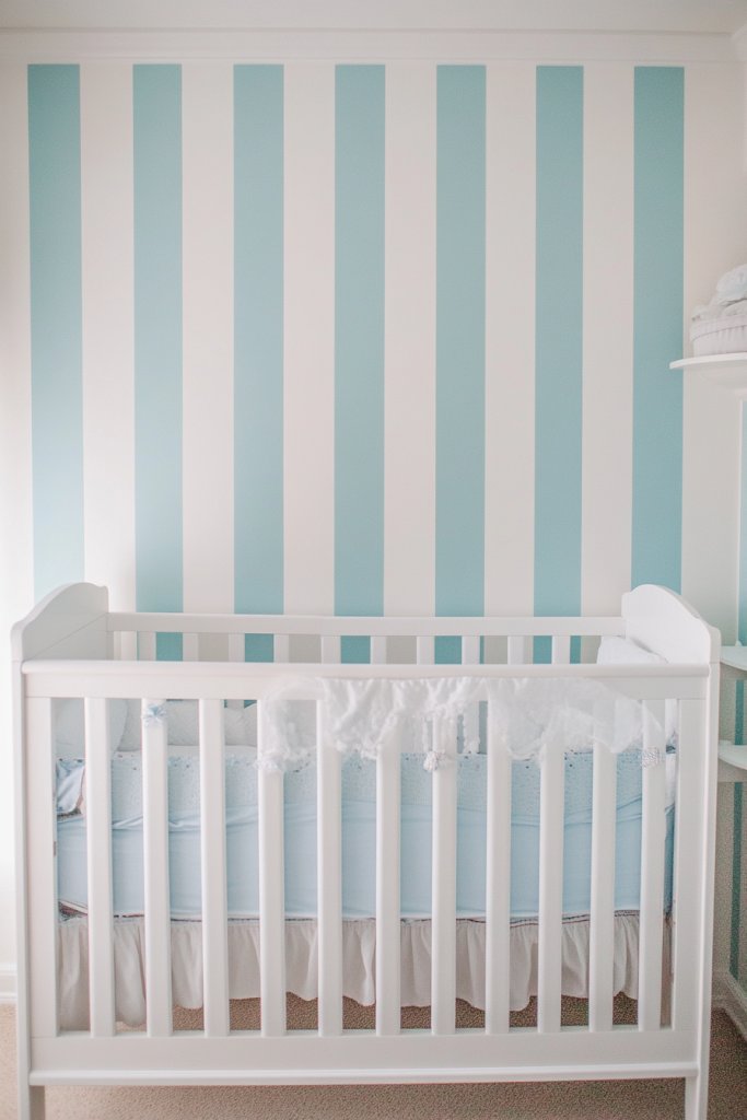 Want to add playful energy to your nursery without overwhelming the space? Vertical stripes in two-tone colors create visual height and fun. It’s an easy way to make the room feel lively yet cohesive. Perfect for parents aiming for a cheerful, dynamic environment.