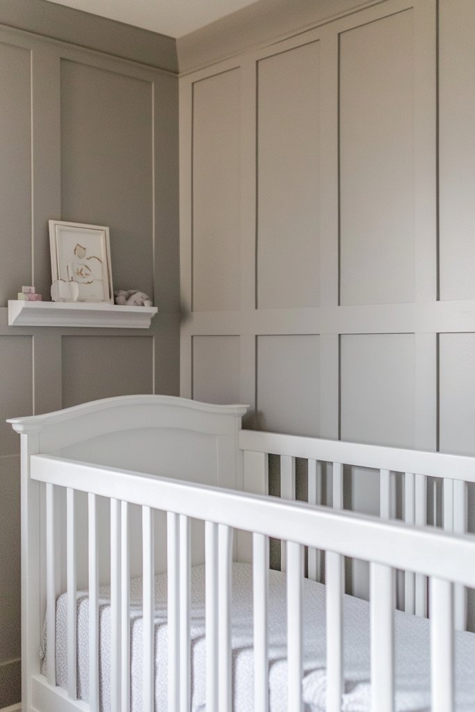 Want a nursery that reads traditional but with a luxurious twist? Wide board and batten combined with decorative molding instantly elevates the space. It adds a sense of grandeur without overwhelming the room. Ideal for parents who love classic elegance with a bit of flair.