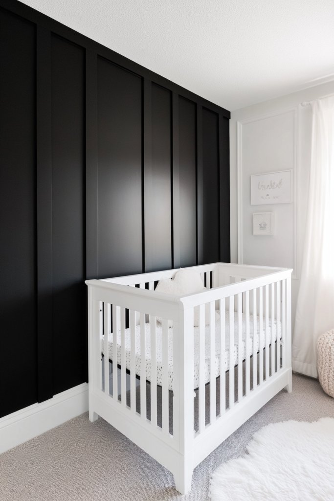 Craving a nursery that’s bold and eye-catching? Black and white board and batten creates a striking contrast that’s both modern and sophisticated. It’s perfect for parents who want a high-impact look without sacrificing style. Think classic with a contemporary twist.
