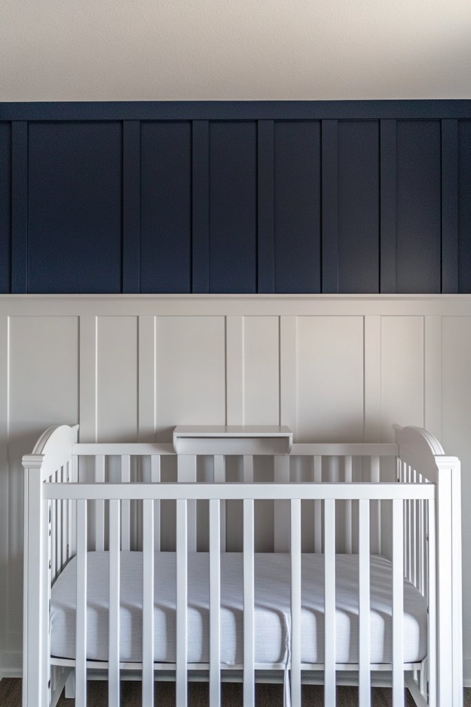 Looking to add some personality to your nursery without overwhelming the space? Two-tone board and batten is a fantastic way to make a statement while still keeping things cozy. The contrast between the crisp white battens and a bold upper wall color creates a striking visual impact. It’s perfect for parents who want a little drama with their charm.
