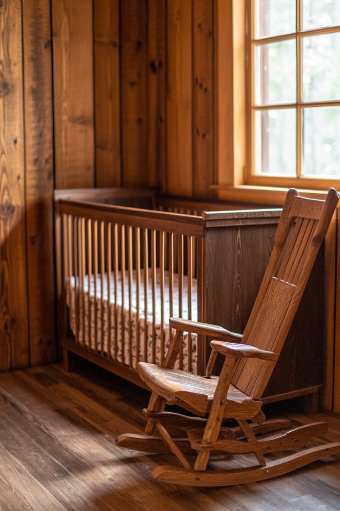 Imagine warm honey-colored wood panels running vertically or horizontally along the walls. The natural grain and knots add character, giving the nursery a handcrafted vibe. Soft textiles in neutral shades, like a plush cream rug or linen curtains, enhance the rustic feel. The room feels both peaceful and nurturing—like a cozy cabin retreat.
