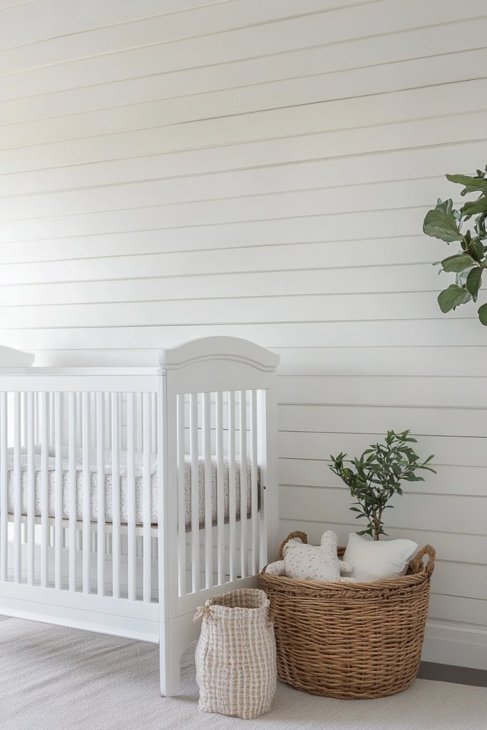 Visualize crisp white battens framing a bold, saturated wall—perhaps deep navy, blush pink, or mustard yellow. The contrast draws attention to the feature wall, making it the centerpiece of your nursery. Keep other walls neutral or light to balance the look. Soft textiles and subtle decor complete the scene, emphasizing the feature without clutter.