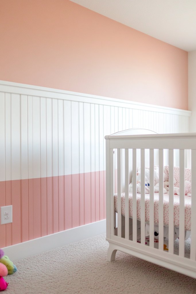Imagine pristine white walls with evenly spaced vertical panels reaching halfway up the wall. A subtle blush pink or baby blue trim runs along the edges, giving a gentle pop of color. Soft, plush textiles like a neutral rug and cozy throw pillows complement the look. The room feels airy, calm, and inviting—like a fresh cloud on a spring morning.