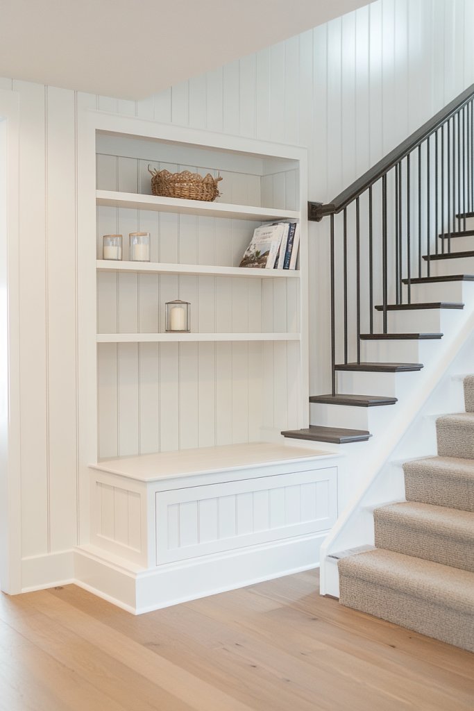 Want to maximize storage without sacrificing style? Built-in shelving integrated with board and batten panels turns your staircase into a functional focal point. It’s perfect for displaying books, decor, or organizing daily essentials. If clutter is your nemesis, this idea helps tame it with elegance.