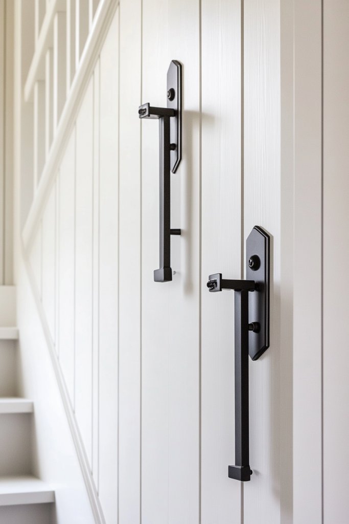 Imagine matte black handrails, brackets, or decorative nails contrasting against crisp white or muted gray panels. The dark hardware pops visually, giving weight and structure to the overall design. The textures and finishes create a rugged yet refined aesthetic that feels curated and intentional. It’s a perfect blend of rustic warmth and urban edge.