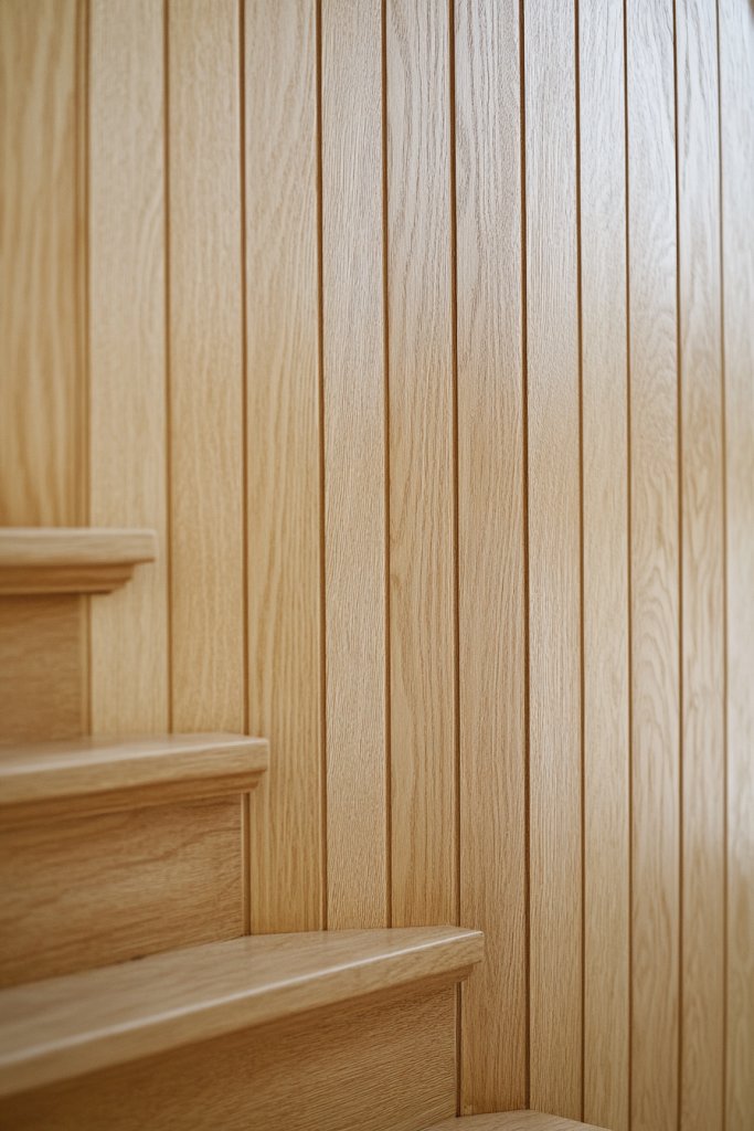 Looking for a gentle, cottage-inspired look that feels cozy and delicate? Narrow vertical boards with rounded edges soften the overall appearance while maintaining rustic charm. It’s perfect for creating a subtle, inviting atmosphere in your staircase area. If you love charming, handcrafted aesthetics, this is ideal.
