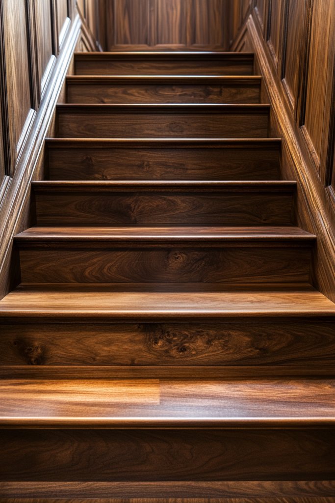 Incorporate decorative brass or gold accents, or add carved motifs for a bespoke touch. Use soft lighting to enhance the wood’s natural glow. Personalize with engraved initials or family emblems. This luxurious finish makes your staircase a true focal point.