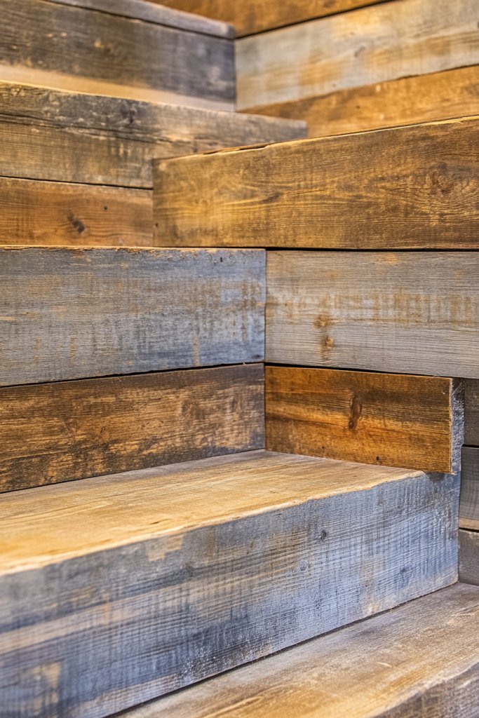 Visualize a staircase clad in aged, weathered planks with knots and imperfections that tell a story. The textures vary from smooth to rough, inviting touch and curiosity. The natural patina of reclaimed wood adds depth, with hues ranging from warm browns to cool greys. It’s like bringing a piece of history into your home, adding layers of visual interest.
