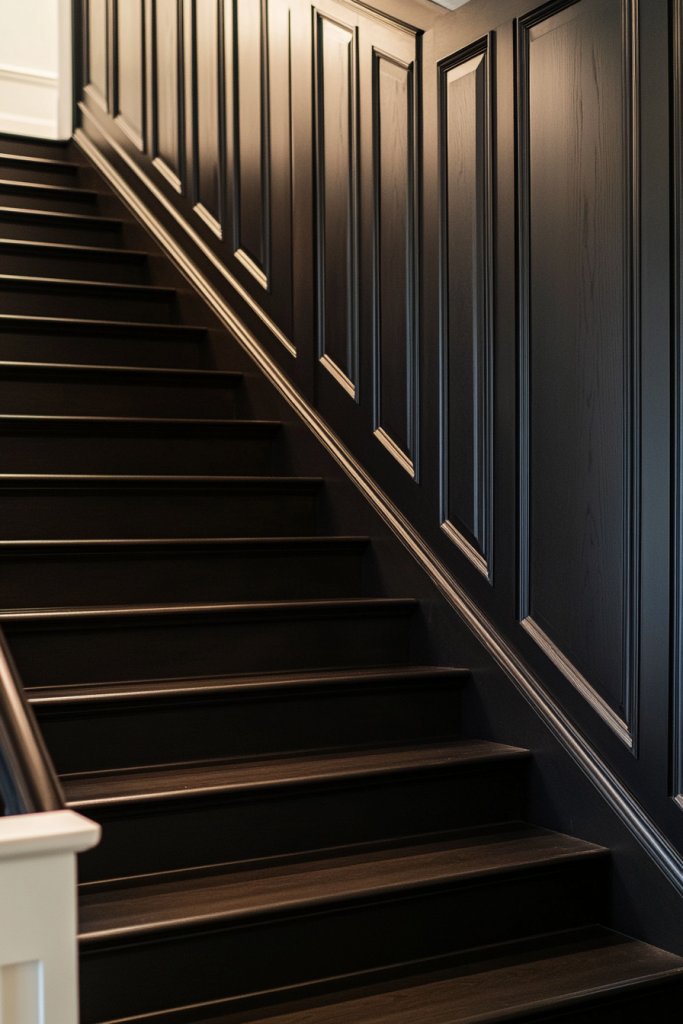 Picture a staircase with deep espresso or charcoal panels that absorb light and anchor the room. The vertical battens emphasize height, while the dark stain brings out the wood grain’s richness. Combined with lighter flooring or trim, this style becomes a focal point that exudes elegance and strength. It’s like a moody, artful backdrop for your home.