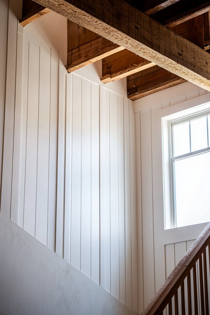 Ever wish your staircase could have a more architectural presence? Vertical board and batten combined with exposed beams instantly elevate the entire space. It adds visual height and structural interest, turning a simple staircase into a statement feature. If you love character-rich interiors, this style is a must-try.