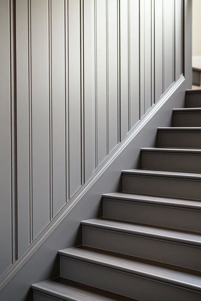 Visualize a staircase with soft gray panels that subtly highlight the wood grain. The muted stain creates a calming effect, blending well with neutral walls and minimalist decor. The vertical battens draw the eye upward, emphasizing height and space. It’s a quiet, elegant backdrop that complements both rustic and modern elements.