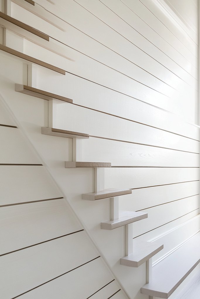 Visualize a staircase wall where vertical battens frame open or closed shelving units. The natural wood or painted surfaces blend seamlessly, creating a custom look. The shelves add depth and provide practical space for your favorite items. This combination makes the staircase both beautiful and useful.