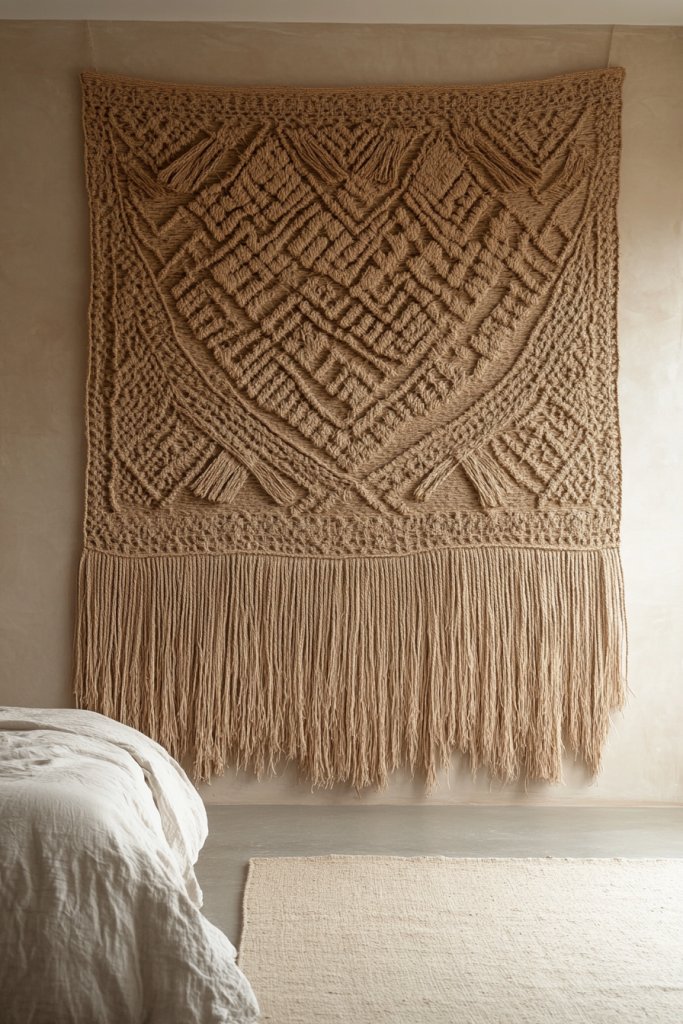 Imagine a large woven wall hanging made from jute, hemp, or seagrass, with intricate patterns and fringed edges. The fibers create a layered, textured surface that catches light and invites touch. The neutral tones blend seamlessly with natural decor, creating a calming atmosphere. It’s like adding a piece of nature directly to your walls.
