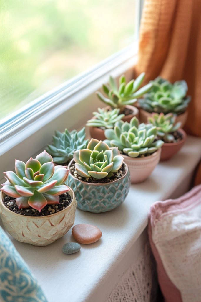Picture a collection of small, colorful succulents in textured ceramic pots arranged on a windowsill or floating shelves. Their fleshy leaves and geometric shapes add visual interest, contrasting with softer textiles and earthy tones. The subtle green hues bring freshness without overwhelming your decor. Light filters softly over the plants, emphasizing their sculptural forms.