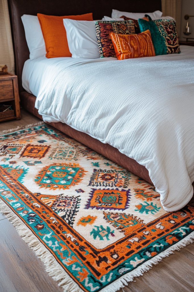 Picture a large, patterned rug placed under the bed, extending beyond the sides to create a soft boundary. Alternatively, smaller rugs can define a reading nook or seating area. Bright colors, tribal motifs, or intricate patterns add visual interest and energy. The layered textures and patterns create a lively, eclectic vibe that invites you to relax.