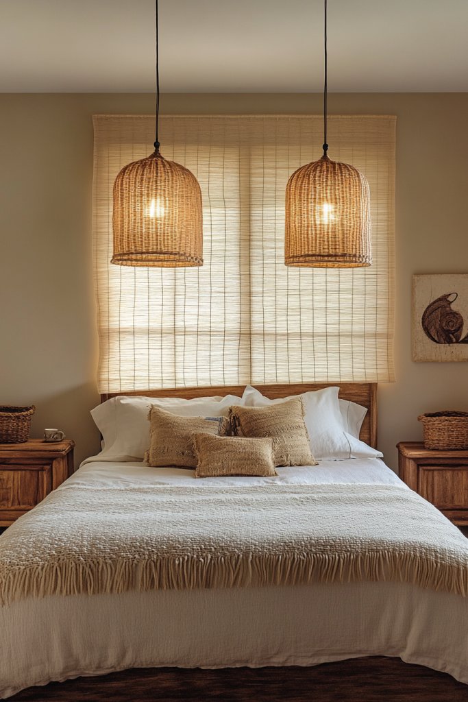 Imagine pendant lights made from rattan, bamboo, or woven fibers hanging above your nightstands or bed. The textured shades cast delicate shadows, creating a cozy, intimate atmosphere. The organic materials add warmth and nature-inspired charm, blending seamlessly with earthy or boho decor. The soft, diffused light enhances textures and colors in the room.