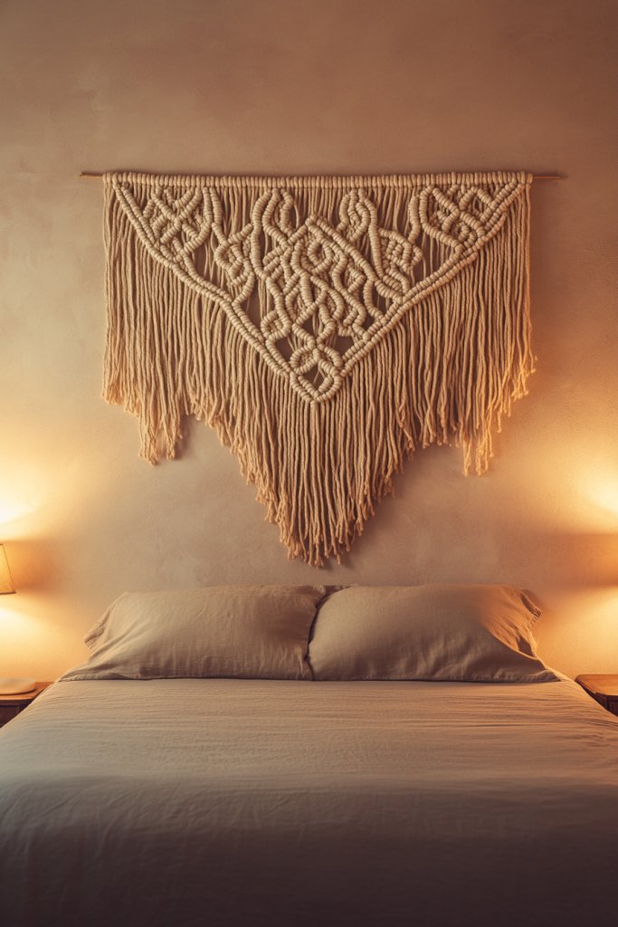 Picture a large, intricate macramé piece hanging above your bed or on a blank wall. The knotted cords create a lush, textured tapestry that catches the light and invites touch. Natural fibers like cotton or jute give it an organic feel, while the detailed knots and fringe add a layered, artisanal vibe. It’s like bringing a piece of craft into your room that you can’t help but admire.