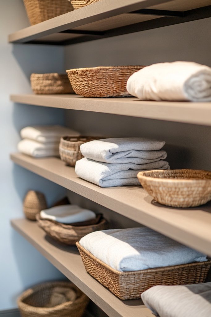 Imagine sleek wooden or metal open shelves mounted on your wall, holding neatly folded textiles, baskets, or decorative objects. They create a layered, airy feel that keeps your room feeling spacious. Arranged thoughtfully, the shelves highlight your personality and add depth to the decor. The open design encourages a curated look rather than clutter.