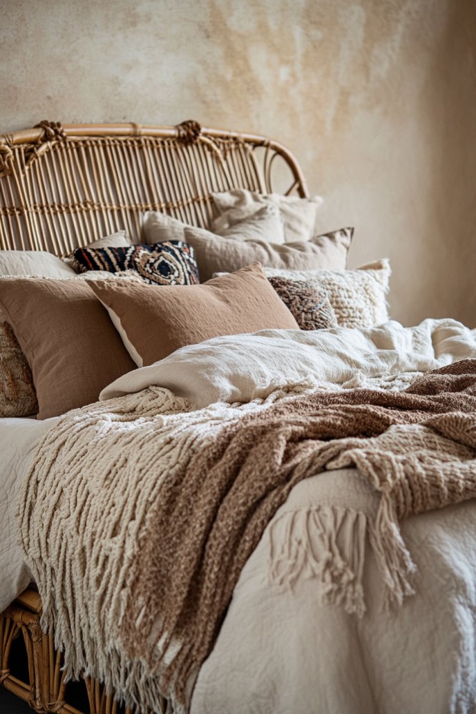 3. Rattan Bed Frame with Boho Bedding Accents