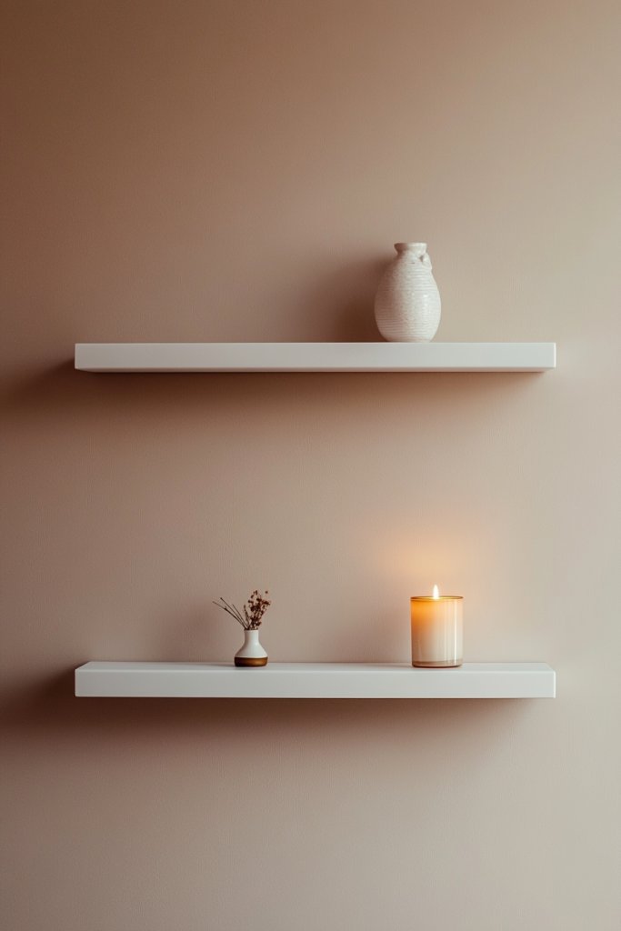 Picture sleek wooden or painted floating shelves mounted high or low on your wall. They hold a curated collection of vintage accessories, travel souvenirs, or meaningful keepsakes. The open display creates visual interest and invites the eye to wander. Combined with soft lighting or decorative boxes, the shelves turn into mini galleries that reflect your style.