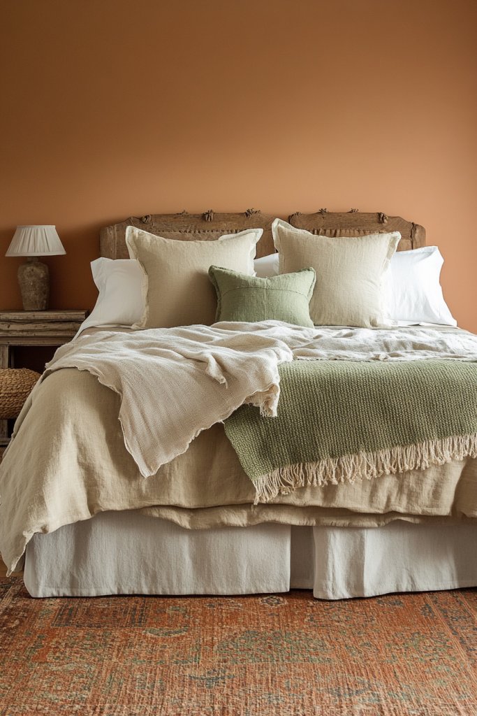 Visualize walls painted in soft taupe or warm beige, complemented by bedding in shades of cream, rust, and moss green. Textured fabrics like linen and cotton enhance tactile comfort, while wooden or woven furniture adds warmth. Layer different shades within the same color family to create depth without visual chaos. The overall effect is a tranquil, cohesive space that feels connected to nature.