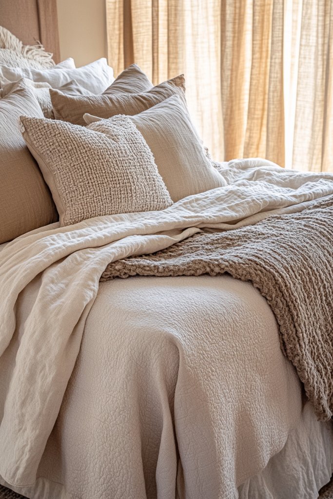 1. Layered Neutral Bedding with Textured Throws for Instant Comfort