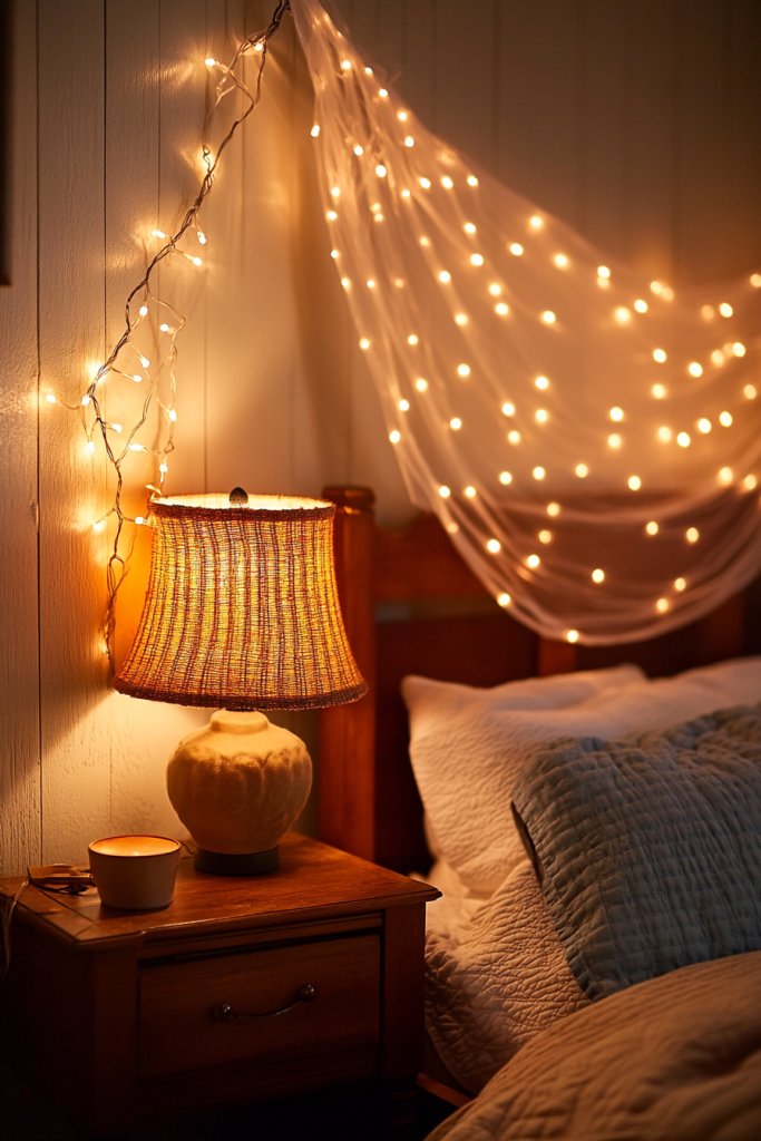 Imagine soft string lights draped across the ceiling or around a window frame, casting a gentle glow. On your bedside table, a vintage-inspired table lamp with a warm bulb provides focused light for reading. The combination creates a layered, cozy effect that feels both intentional and effortless. Shadows dance softly across textured walls, enhancing the room’s charm.
