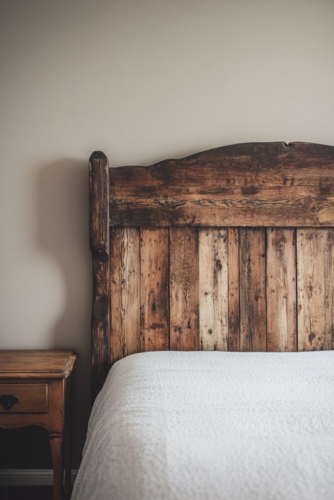Picture a reclaimed wood headboard with visible knots and distressed paint, giving it a weathered yet cozy look. It anchors the bed with a sense of history, as if it’s been part of countless stories. Soft lighting highlights the textures, casting warm shadows that deepen the vintage feel. The headboard pairs beautifully with linen bedding and wrought iron accents, creating a layered, inviting aesthetic.
