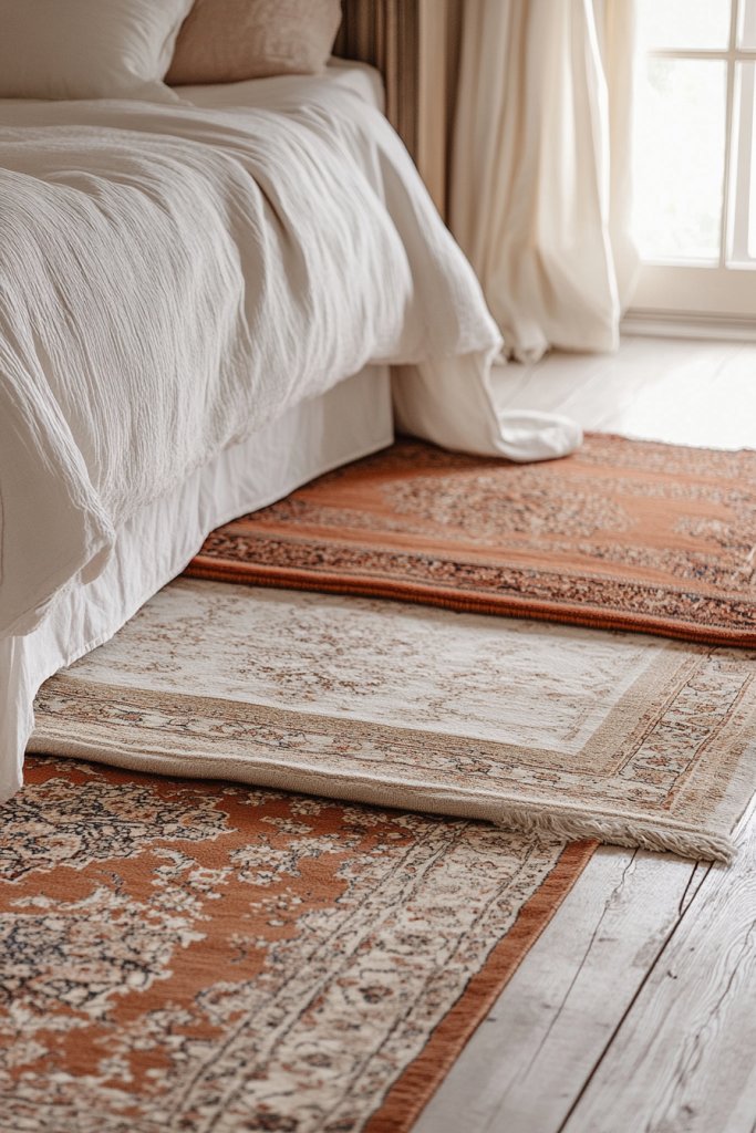 Mix different textures, such as shag, flatweave, or braided rugs, for contrast. Use larger rugs to anchor the bed and smaller ones for accent areas. Seasonal layering could include adding a faux fur rug during winter or a light cotton one for summer. Keep the color palette within warm, earthy tones to maintain harmony.