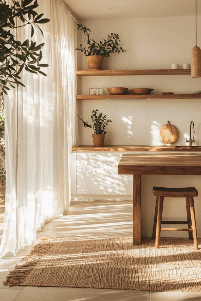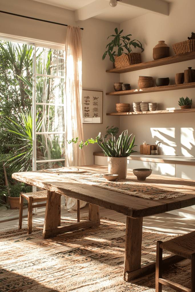 Natural wood elements can breathe life into your boho kitchen, creating a warm and inviting focal point. Think rustic wooden shelves that display your favorite cookbooks and handcrafted pottery. You might consider a reclaimed wood island, which not only serves as a functional workspace but also adds character with its unique grains and textures. Incorporating wooden accents—like a butcher block countertop or a natural wood dining table—can enhance the earthy vibe. Don’t forget about smaller details, too; wooden utensils and cutting boards add charm without overwhelming the space. By mixing different wood tones, you’ll create depth and visual interest, ensuring your kitchen feels both stylish and cozy. Embrace the beauty of nature in your cooking haven!