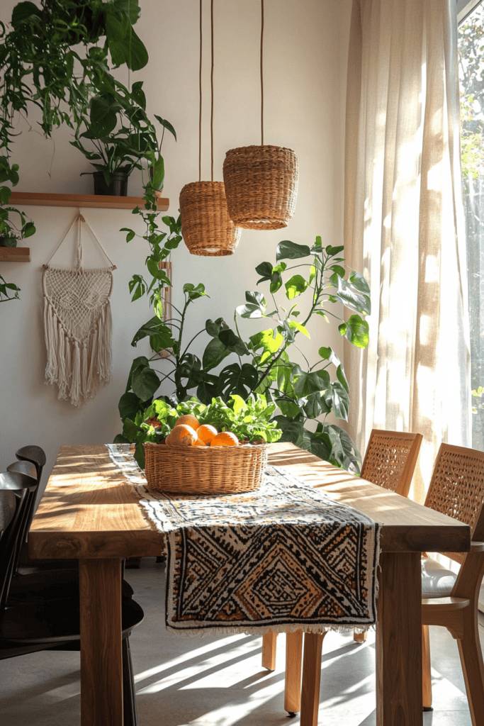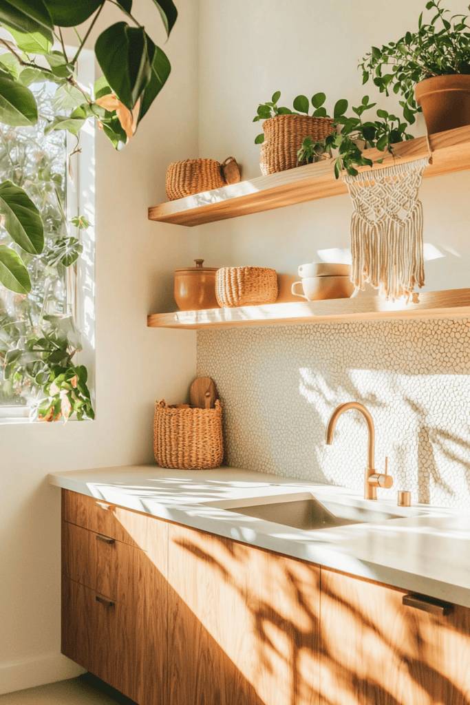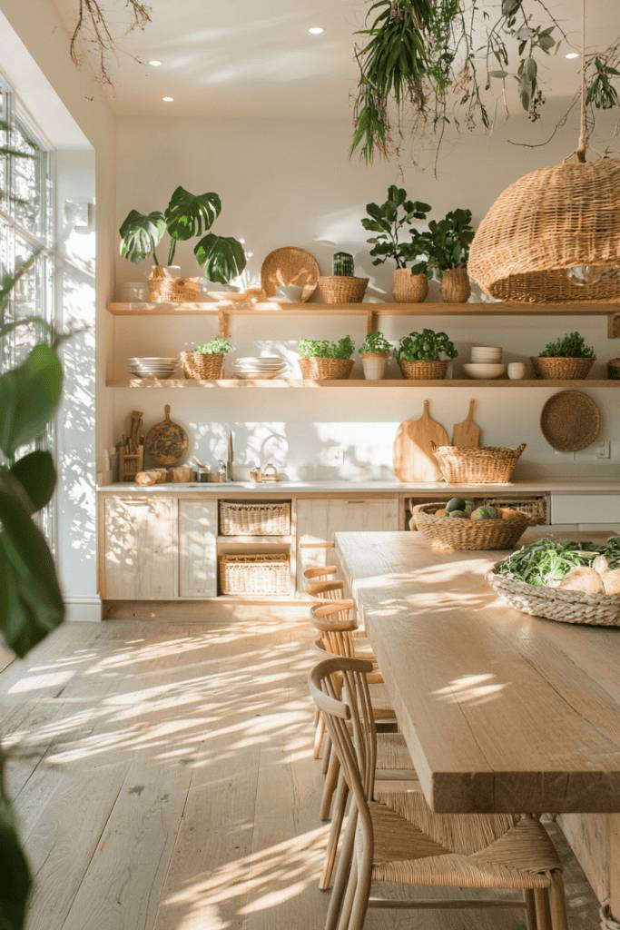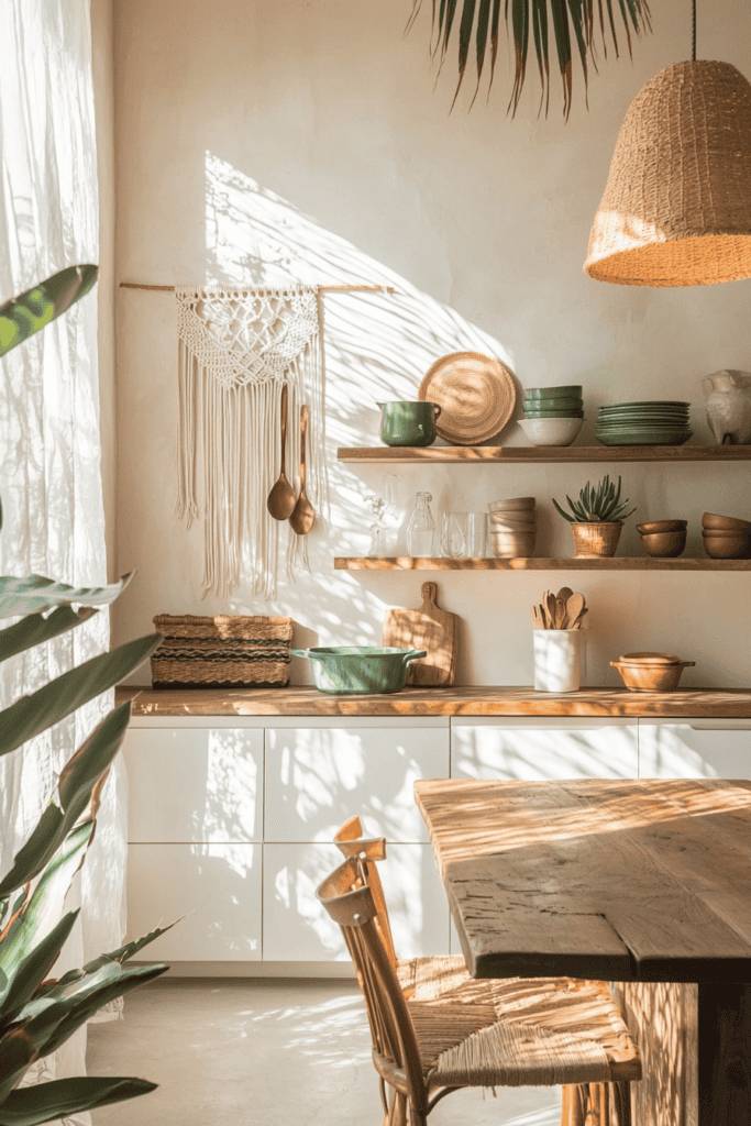 While you might think of woven baskets as mere storage solutions, they can also be stunning decorative accents in your boho kitchen. Imagine clusters of various-sized baskets hanging on the wall, adding texture and warmth to the space. You can use them to store fruits, herbs, or even kitchen linens, keeping everything tidy yet stylish.
