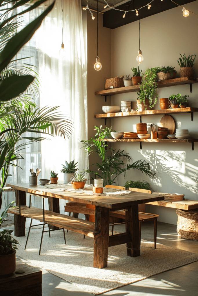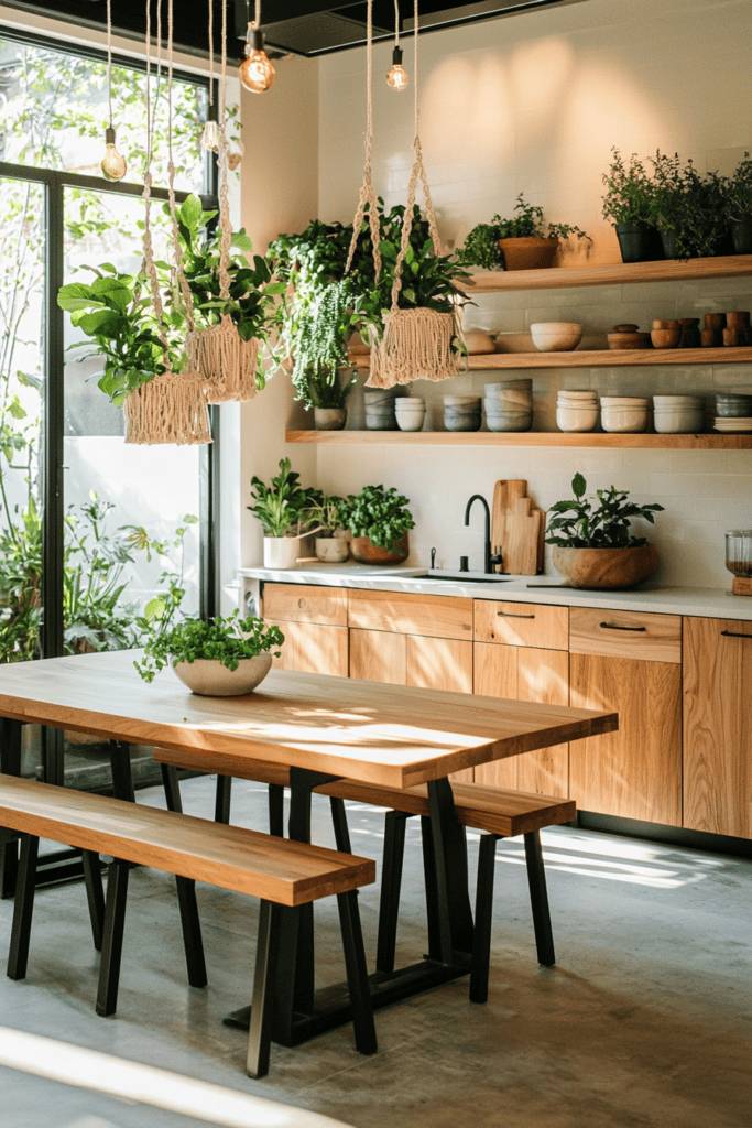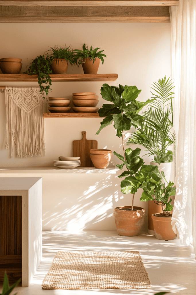 Integrating plants into your kitchen not only breathes life into the space but also enhances the bohemian aesthetic you’re aiming for. Consider adding hanging planters filled with trailing greens like pothos or string of pearls. They create a whimsical vibe while utilizing vertical space. Countertops are perfect for vibrant herbs—think basil, mint, or rosemary—offering both beauty and culinary benefits. If you’ve got sunny windows, large leafy plants like fiddle leaf figs can make a striking statement. Don’t shy away from mixing textures, either; ceramic pots, woven baskets, and reclaimed wood containers all contribute to that laidback feel. With the right plants, your kitchen transforms into a lively, inviting atmosphere that reflects your unique style.