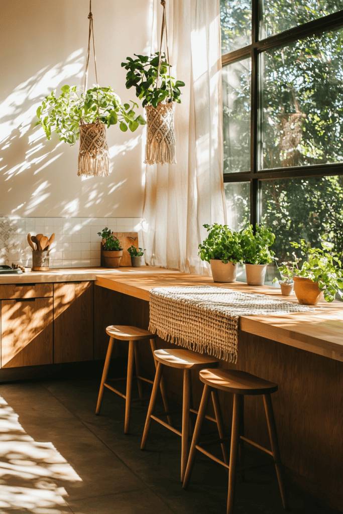 Bringing in macramé wall art can elevate the bohemian vibe of your kitchen, complementing the warmth of natural wood elements beautifully. These intricate, knotty designs add texture and depth, creating a focal point that draws the eye. Hang a large piece above your kitchen table or smaller ones along a wall for an eclectic gallery effect. Choose neutral tones to maintain a calm atmosphere, or opt for vibrant colors to make a bold statement. Macramé not only serves as art but also softens the hard lines of cabinets and appliances, enhancing the laidback feel. Incorporating this handcrafted touch showcases your personality and connects your culinary space to the earthy, artistic spirit of bohemian design.