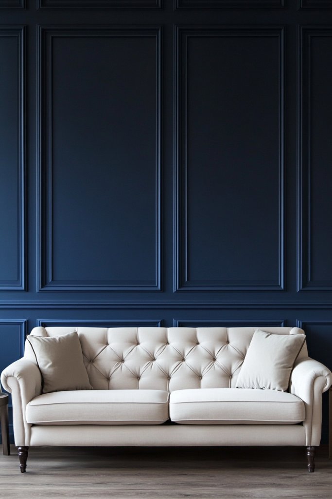 Picture a deep navy accent wall that anchors a room with a rich, velvety hue. It reflects light softly, giving a subtle sheen that feels opulent. Surround it with crisp white trim and warm wooden furniture for contrast, making the navy pop without overwhelming. Imagine plush textiles and metallic accents adding shimmer that complements the deep hue, creating a balanced, elegant atmosphere.