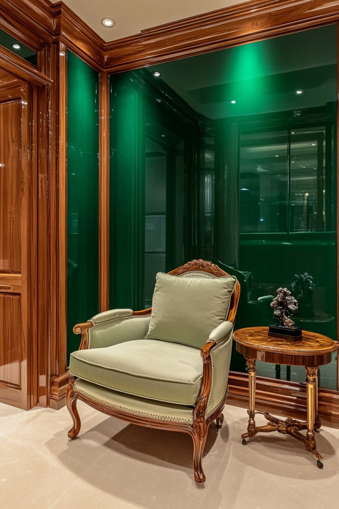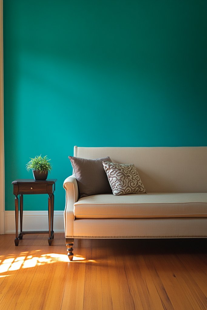 Envision a striking emerald accent wall paired with warm wood tones and textured textiles. The deep green reflects natural light beautifully, creating a lively yet calming atmosphere. Complement it with brass or gold accents that catch the eye and add a touch of luxury. Imagine soft velvet cushions and a plush area rug grounding the space, making it feel like a lush retreat.