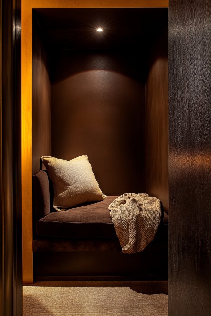 Visualize a deep chocolate accent wall complemented by soft lighting and plush textiles. The rich hue enhances textures and creates a cocoon-like environment perfect for relaxing. Pair it with warm metallic accents like gold or bronze and natural wood furniture for a rustic yet refined appeal. Imagine a cozy reading nook or intimate dining area with this warm backdrop.