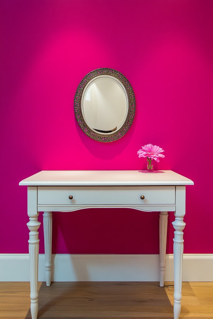 Imagine a feature wall in a bedroom or fashion-inspired space painted in vivid hot pink, paired with sleek metallic accents and minimal furniture. The color’s boldness energizes the room, making it feel lively and confident. Layer textures like silk cushions or velvet drapes to add depth and softness. Soft lighting enhances its vibrancy, creating a fun yet elegant ambiance.