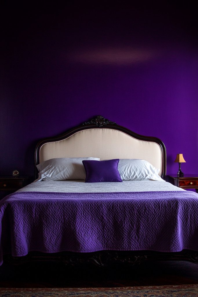 Visualize a bedroom or formal living area with a rich royal purple wall complemented by gold accents and plush textiles. The deep hue reflects light beautifully, creating a luminous, opulent atmosphere. Layered lighting, such as chandeliers or sconces, enhances its regal feel. Decorative trims or moldings in metallic tones add further sophistication.