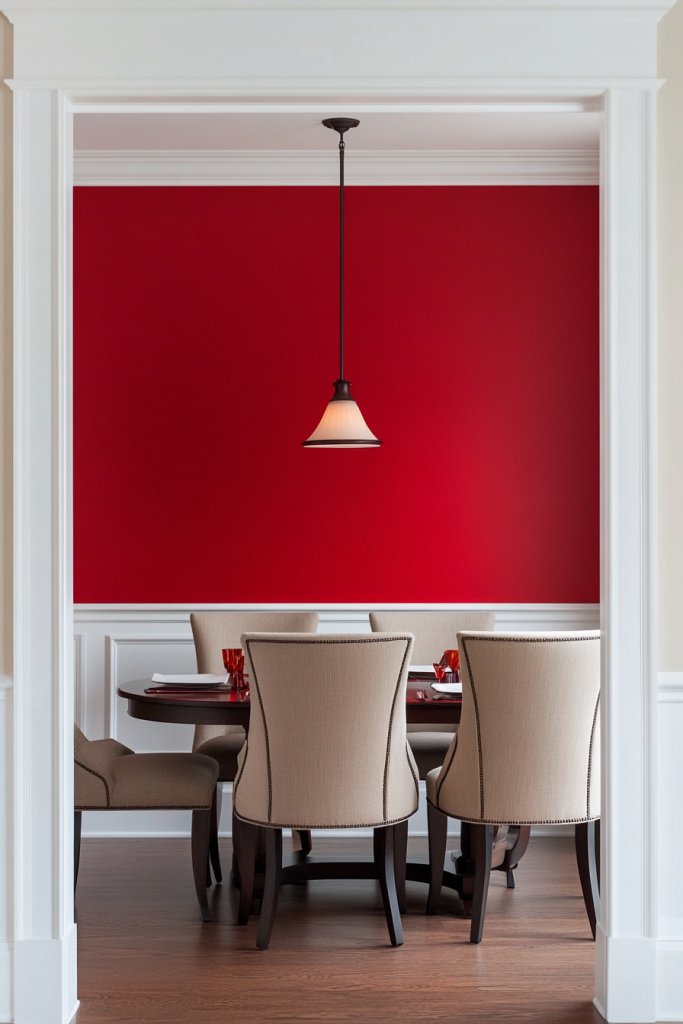 Visualize a striking crimson accent wall paired with neutral furniture to let the color stand out. The deep, rich tone radiates warmth and vitality, almost like a heartbeat on your wall. Imagine soft lighting that enhances the vibrancy, making the space feel lively yet inviting. Textured fabrics and subtle metallic accents amplify the passion without overwhelming your senses.