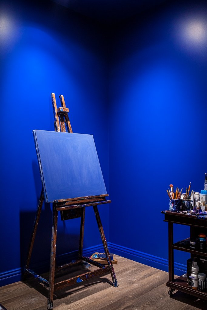 Imagine a deep ultramarine accent wall in a creative workspace, paired with metallic or white accents. The color’s richness accentuates textures and creates a dramatic backdrop for artwork or decor. Layered lighting plays a crucial role—spotlights or LED strips highlight the depth and vibrancy of the color. The result is a space that feels artistic and energized.
