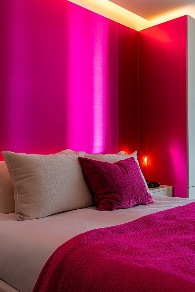 Combine hot pink with metallics like gold, silver, or brass for a glamorous vibe. For a more eclectic look, mix with patterns and layered textiles—think animal prints or geometric designs. During daytime, natural light makes the color pop; at night, use layered lighting to keep it lively. Use it as an accent or feature wall to maximize its impact.