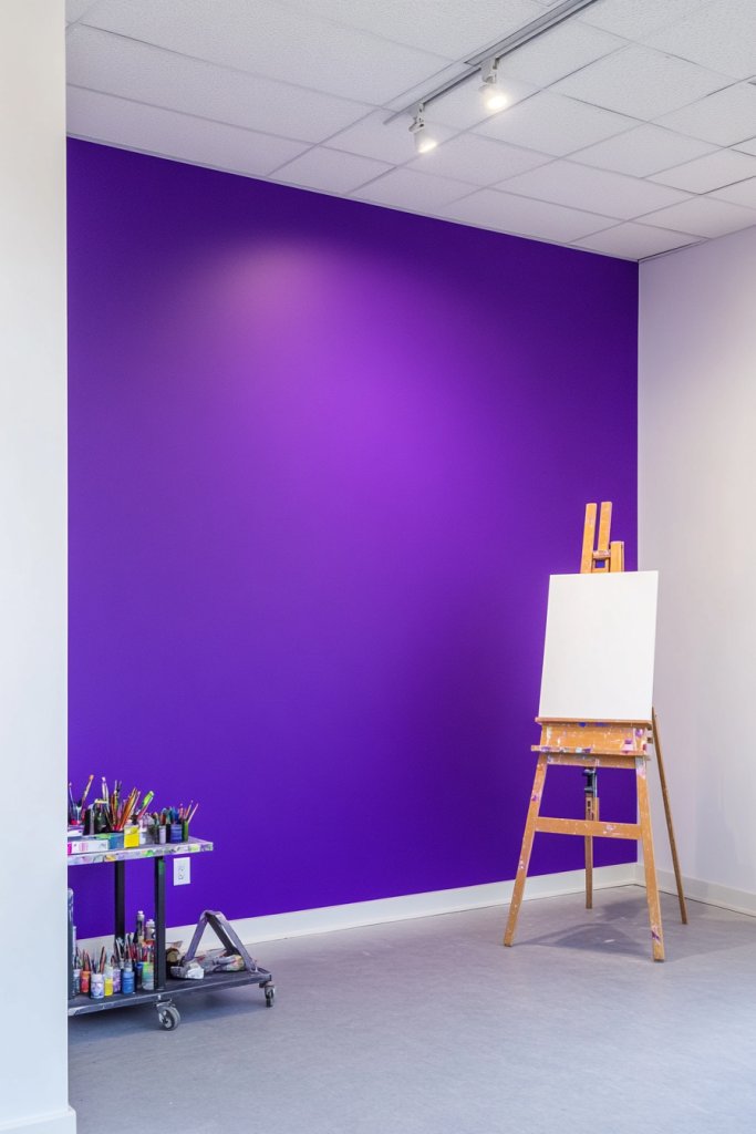 Imagine a vivid purple wall paired with sleek metallic accents and minimalist furniture. The color radiates energy, especially under layered lighting that enhances its vibrancy. Incorporate textured textiles like velvet or silk cushions to add depth and richness. Visualize a creative studio or lounge that feels alive and full of inspiration, where bold color acts as a catalyst for ideas.