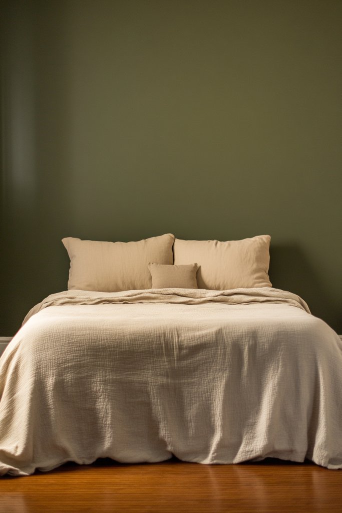 Select a matte olive green paint that emphasizes the subtlety of the hue. Prepare your walls carefully, cleaning and priming for an even finish. Use painter’s tape for precise edges if combining with other colors or creating patterns. Apply two coats, allowing adequate drying time. Incorporate natural textures and warm lighting to bring out the earthy richness of the color. Keep decor minimal and organic.
