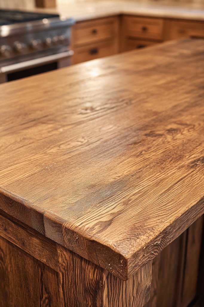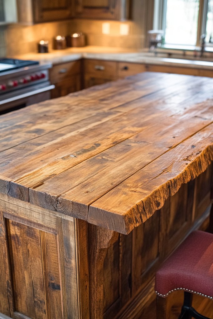 Picture a thick slab of reclaimed wood with rugged, uneven live edges, showcasing natural knots and grain patterns. The wood’s warm, rich tones contrast beautifully with matte metal hardware and neutral cabinetry. Imagine running your hand along the textured surface, feeling the history embedded in every imperfection. The rustic charm is amplified by subtle cracks and natural color variations, giving it a truly authentic vibe. It’s like bringing a piece of the forest into your kitchen.