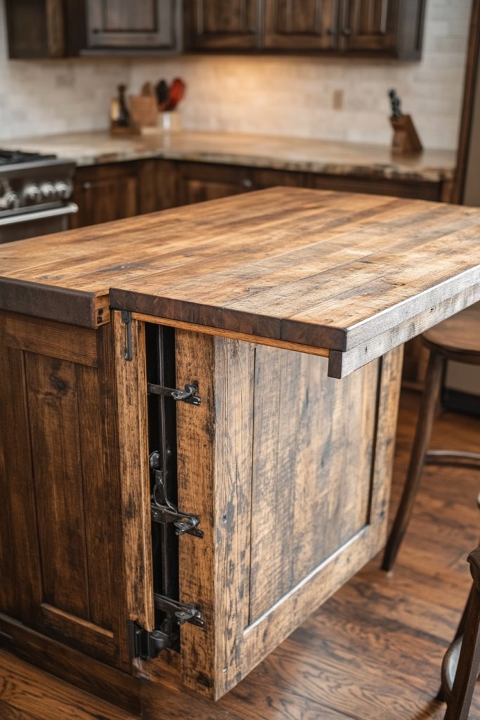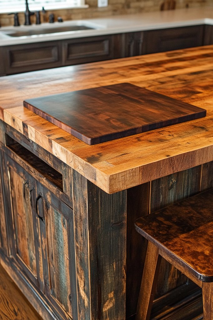 Picture a thick, wooden inset panel on the side of your island, crafted from the same reclaimed wood or distressed finish as the rest of the piece. A sliding or removable cutting board fits snugly into this space, blending perfectly with the rustic design. When in use, it provides a sturdy surface for chopping vegetables or kneading dough. When not needed, it hides away, keeping the look clean and uncluttered. It’s functional art.